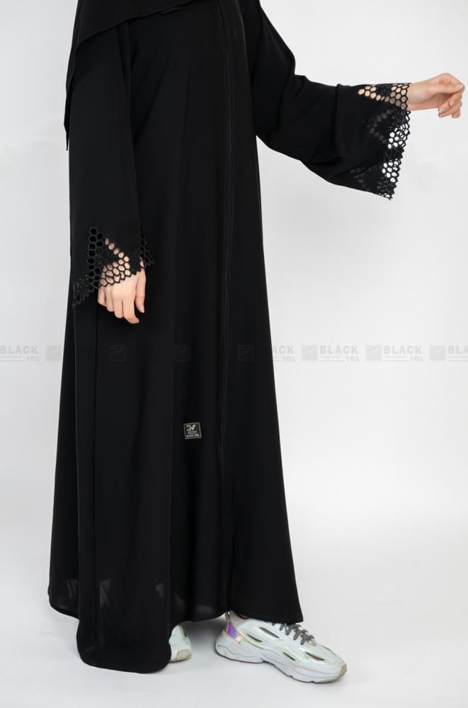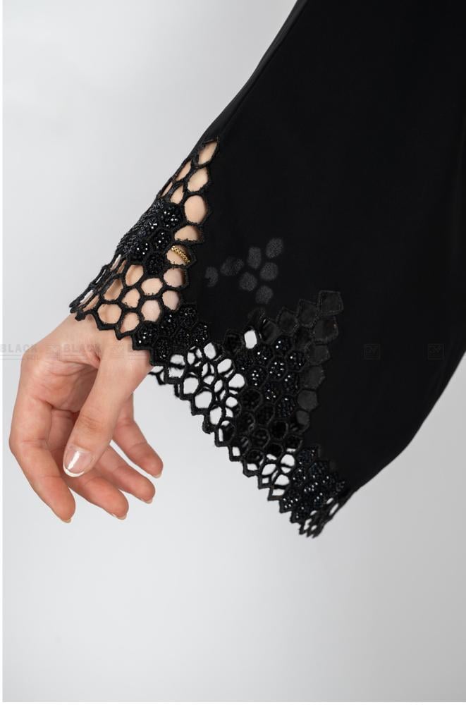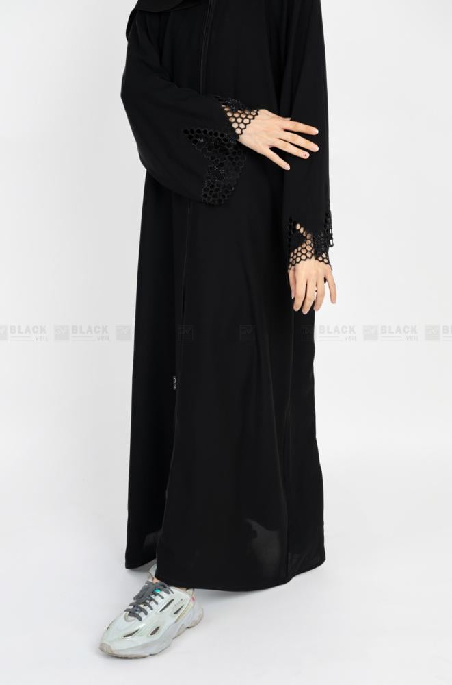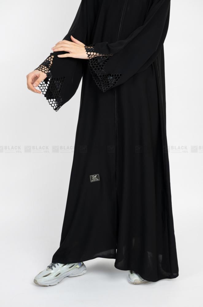 عباية كتف مطرزة بكم شبك مربع من قماش حرير التميز مع طرحة 2متر * 75سم