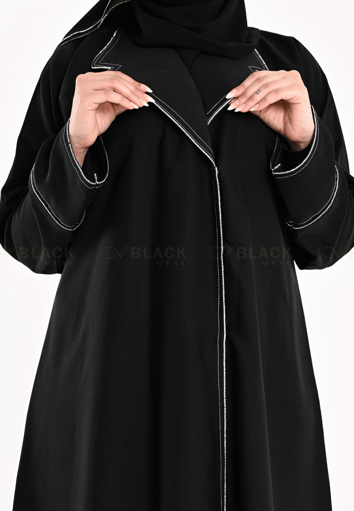 عباية كتف ياقة القماش كريب صالونة الفاخر عليها كلفة بفصوص ابيض مع تحديد بخيط من نفس اللون القفلة طقطق